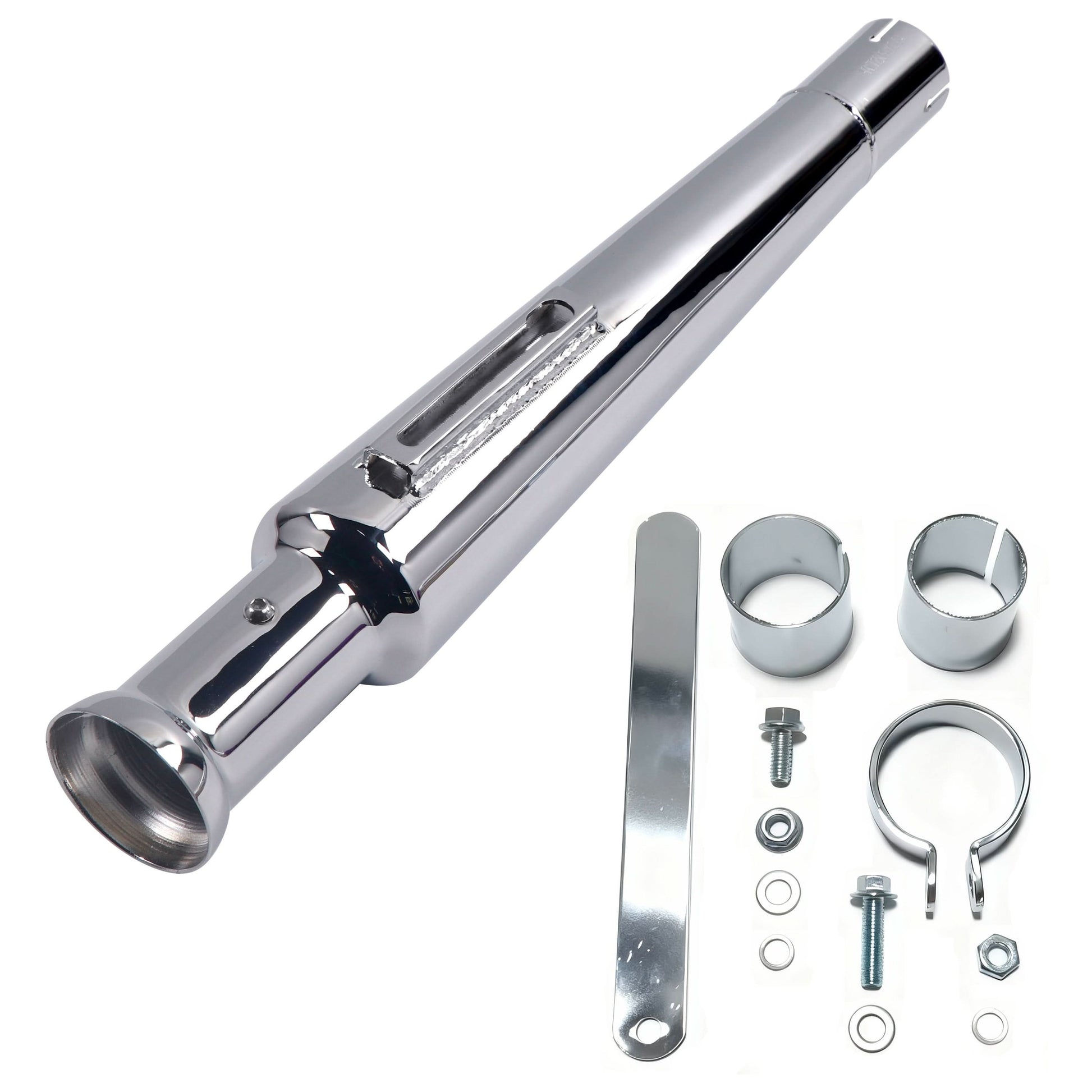 Old School style mufflers' extension. Universal fit or direct replacement. Baffled deep rumble sound.19-1/2" long from the end to the tip overall. Includes a chrome exhaust clamp, these fit 1-3/4" exhaust pipes. They also come with a set of adapters so you can run these on 1-1/2" or 1-5/8" exhaust pipes, as well as the 1-3/4".